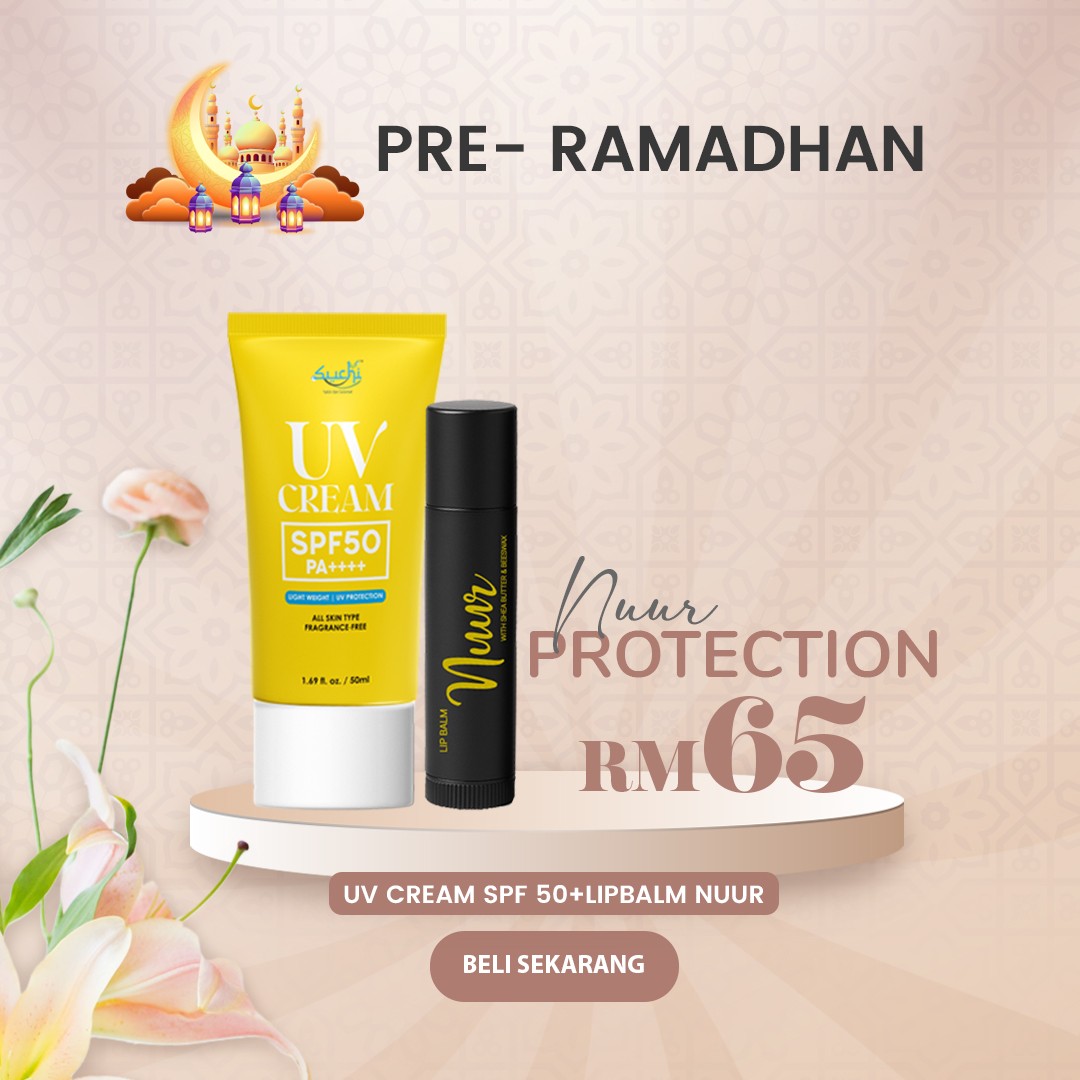 Set ini mengandungi UV Cream SPF50 PA+++ yang melindungi kulit daripada sinaran UV serta membantu mengekalkan kesihatan kulit, dan Lip Balm Nuur yang memastikan bibir kekal lembap, lembut dan selesa.